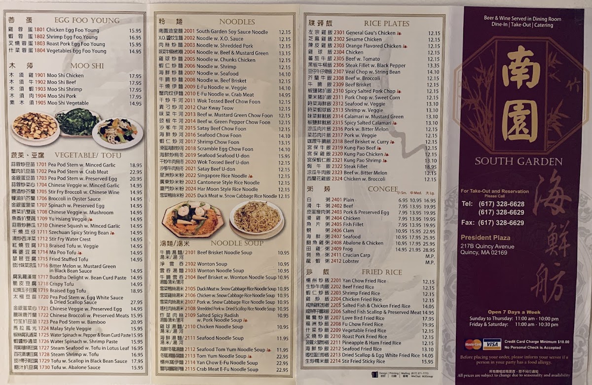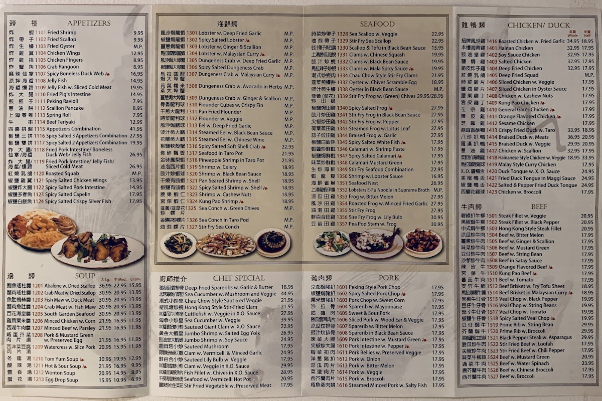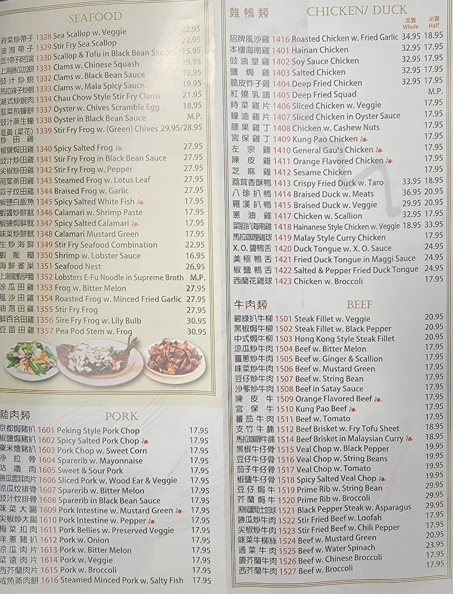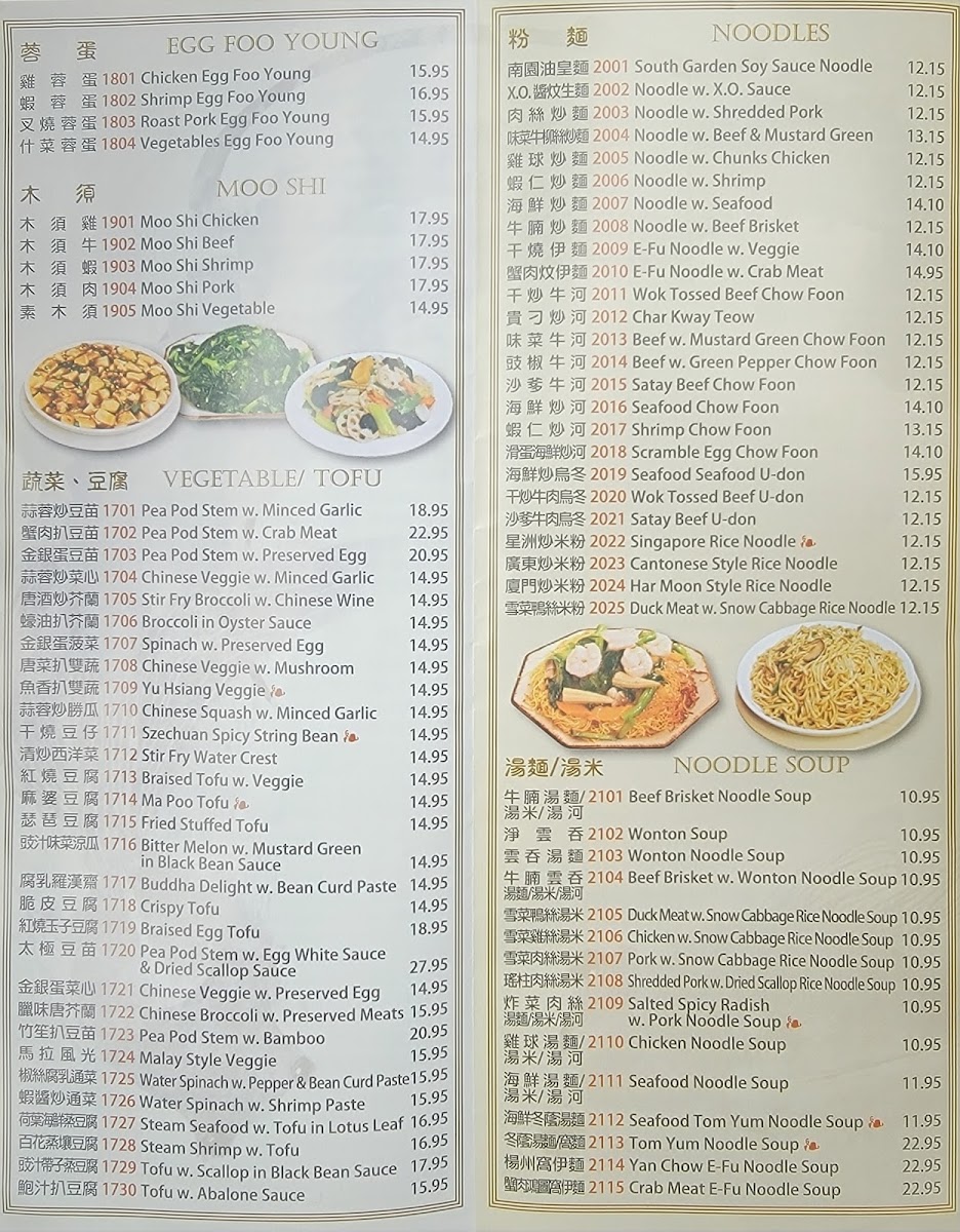 The menu features a variety of traditional Chinese and Cantonese dishes with a focus on fresh seafood, vegetarian options, and classic preparations. It is organized into several main categories, including vegetable tofu dishes, noodle soups, and soups.